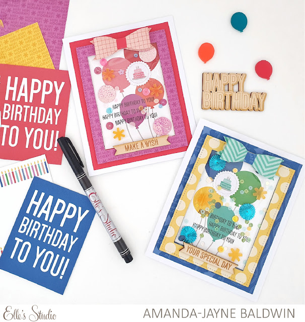 Elle's Studio Supplies: Happy Birthday Journaling Tags, Happy Birthday Chipboard Stickers, Happy Birthday Wood Veneers, Acrylic Balloons & Presents, Celebrate 6 x 8.5 inch Paper Stack, Make A Wish Stamp, Layered Card Metal Die & Acrylic Stamp Block 3 x 4 inches.