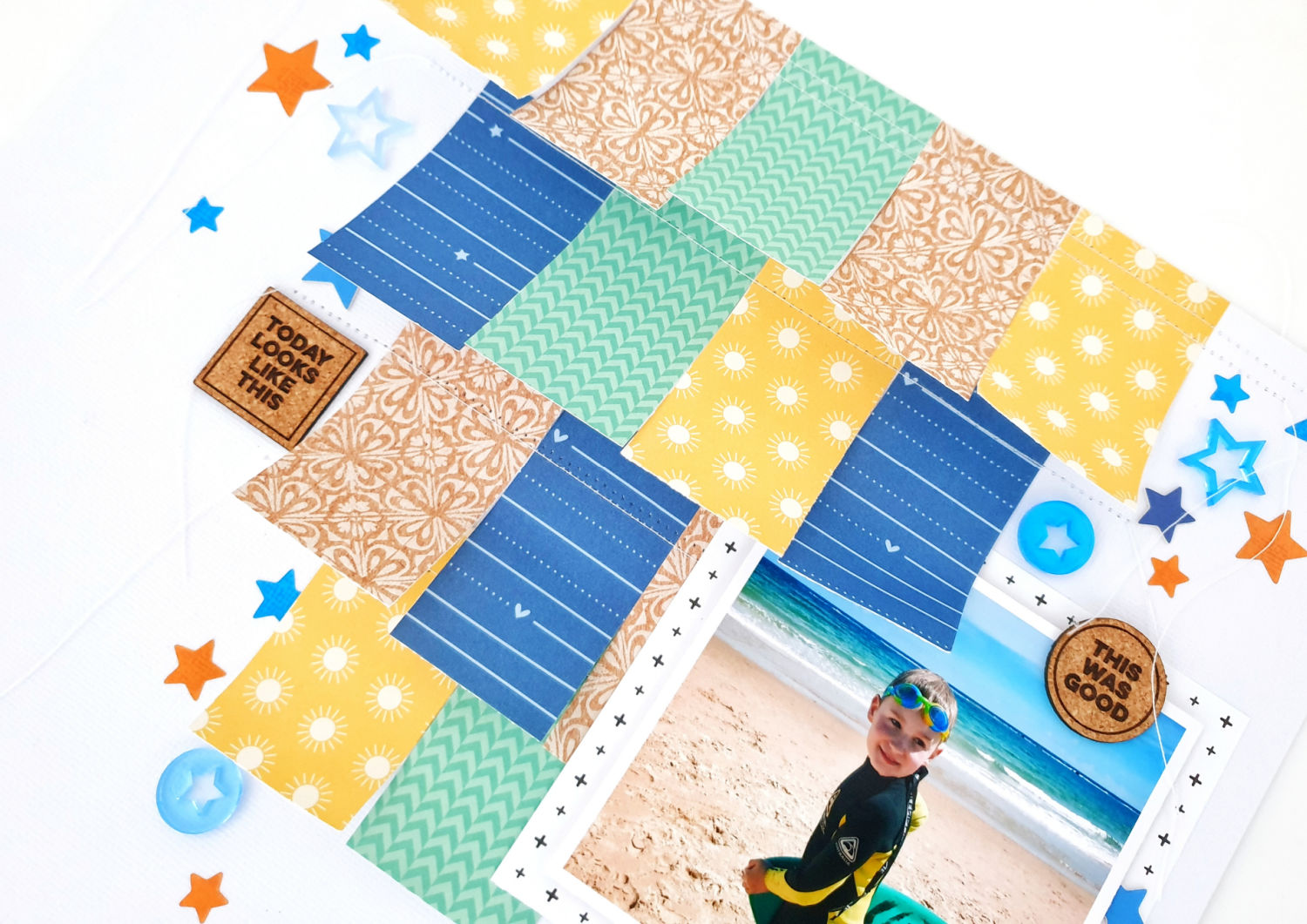 To complete my layout, I embellished with a mix of Cork Labels and all the stars from the June release. A really beautiful page thanks mostly to those Good Times papers!